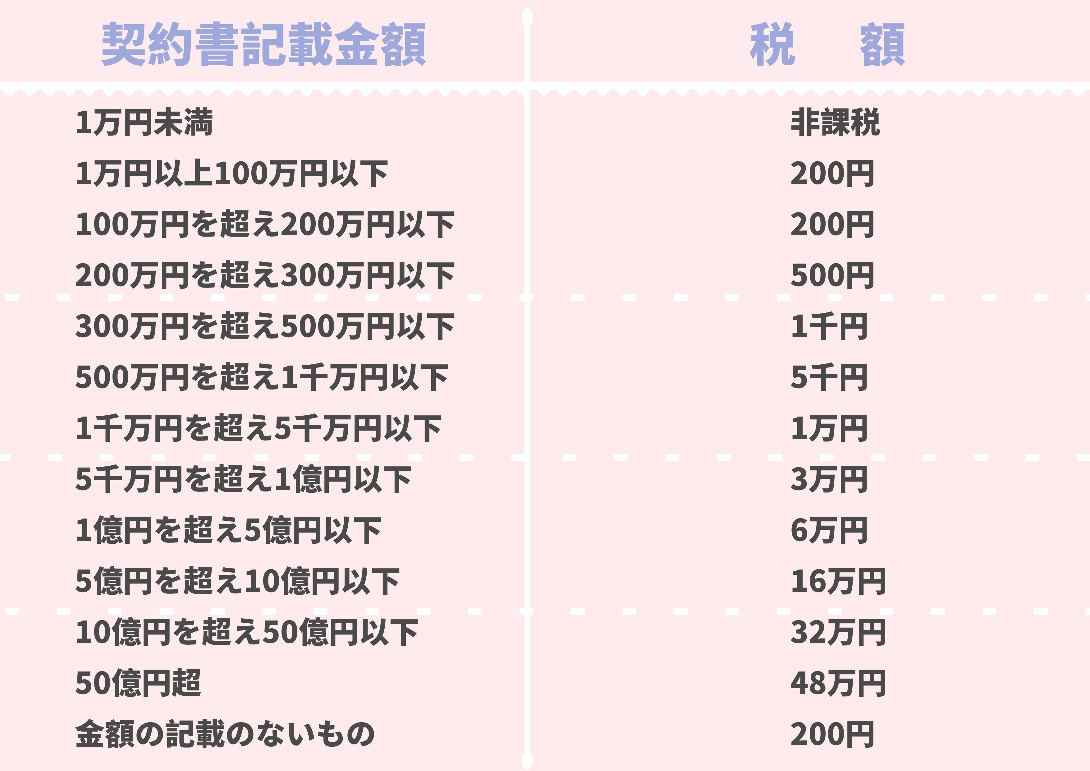 では、次にいくらの印紙を貼ればよいかということですが、下記の表をみて下さい。契約書の種類と記載された金額に応じて印紙税が定められています。