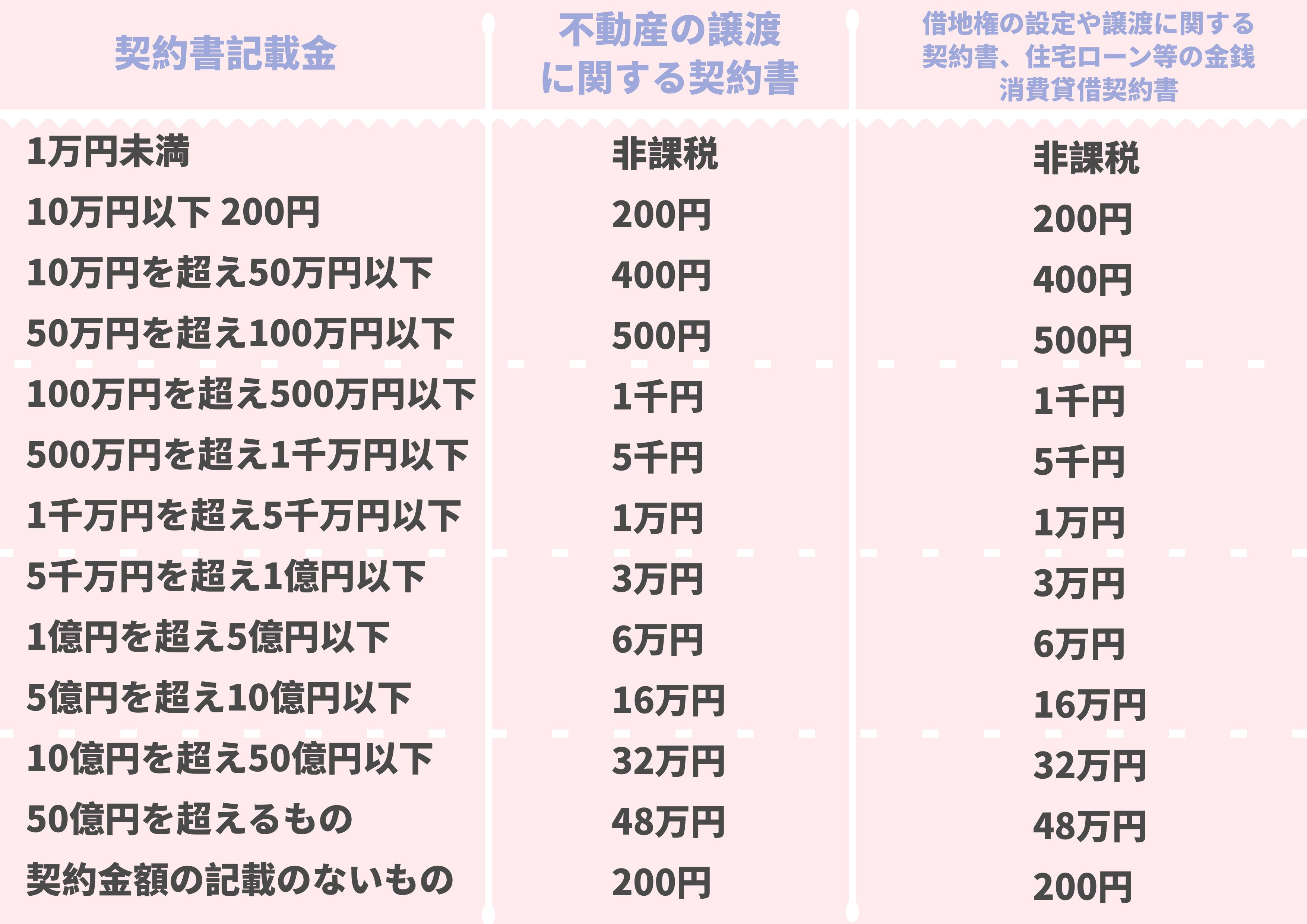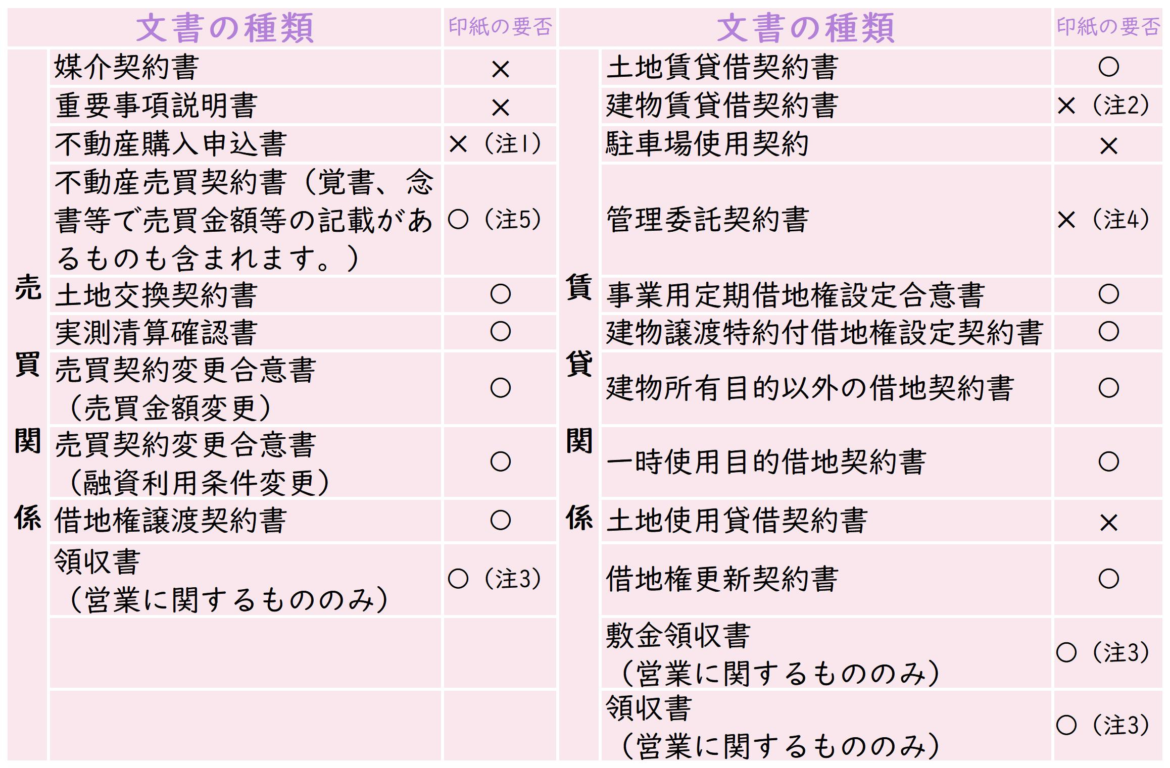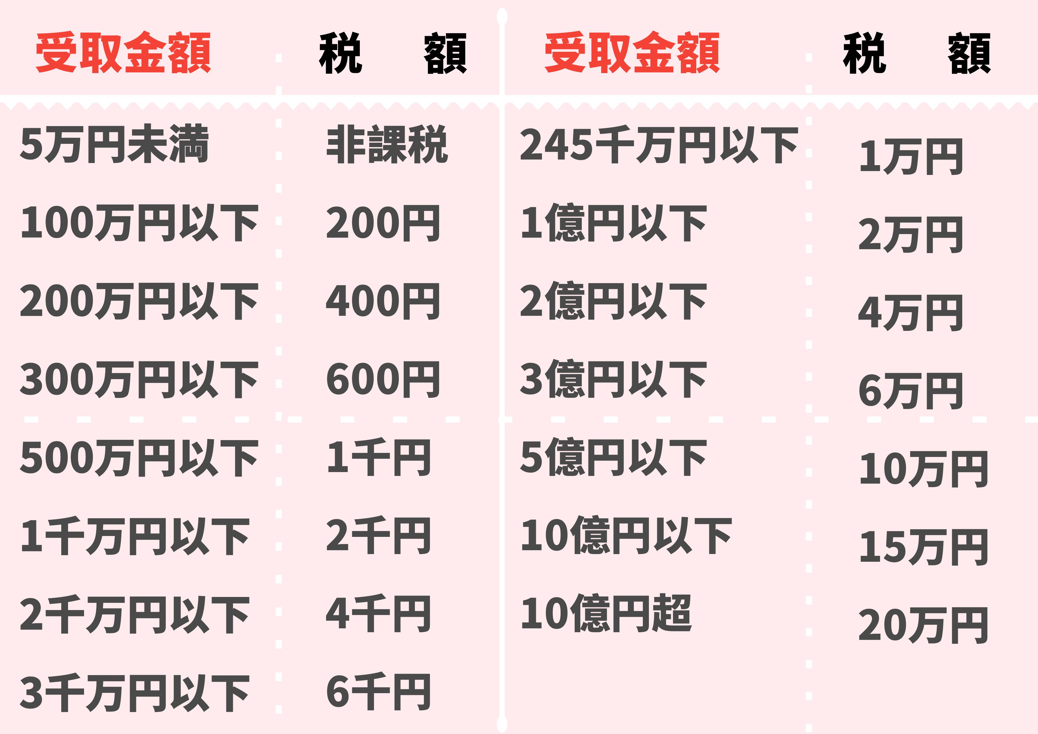 なお、平成26年4月1日から令和6年3月31日までに作成される不動産の譲渡に関する契約書と建築請負に関する契約書については、税額が軽減されています。下記の印紙税額表もこの軽減特例による軽減後の印紙税額を示してあります。そのほか、受取書の税額表も掲載しました。